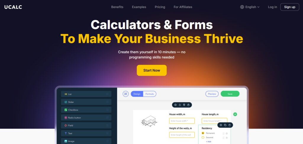 If your “form” is really a quote calculator (service pricing, project estimation, configuration, ROI/savings), uCalc is built for that first. It’s positioned as a builder for calculators and forms, and the whole workflow is centered around formulas and results-then capturing the lead right at the moment of intent.